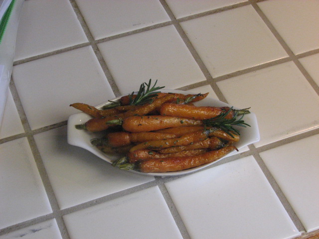 Scrub baby carrots.  Trim off all but 1/2 inch of the greens, arrange carrots in a single layer on a foil-lined baking sheet.  Drizzle with olive oil and roll back and forth to coat.  Roast until carrots are tender when pierced with a fork, about 20-40 minutes.  remove from oven and season with salt and pepper.  Drizzle hot carrots with a little honey and finely chopped fresh rosemary.   Easy and so good!