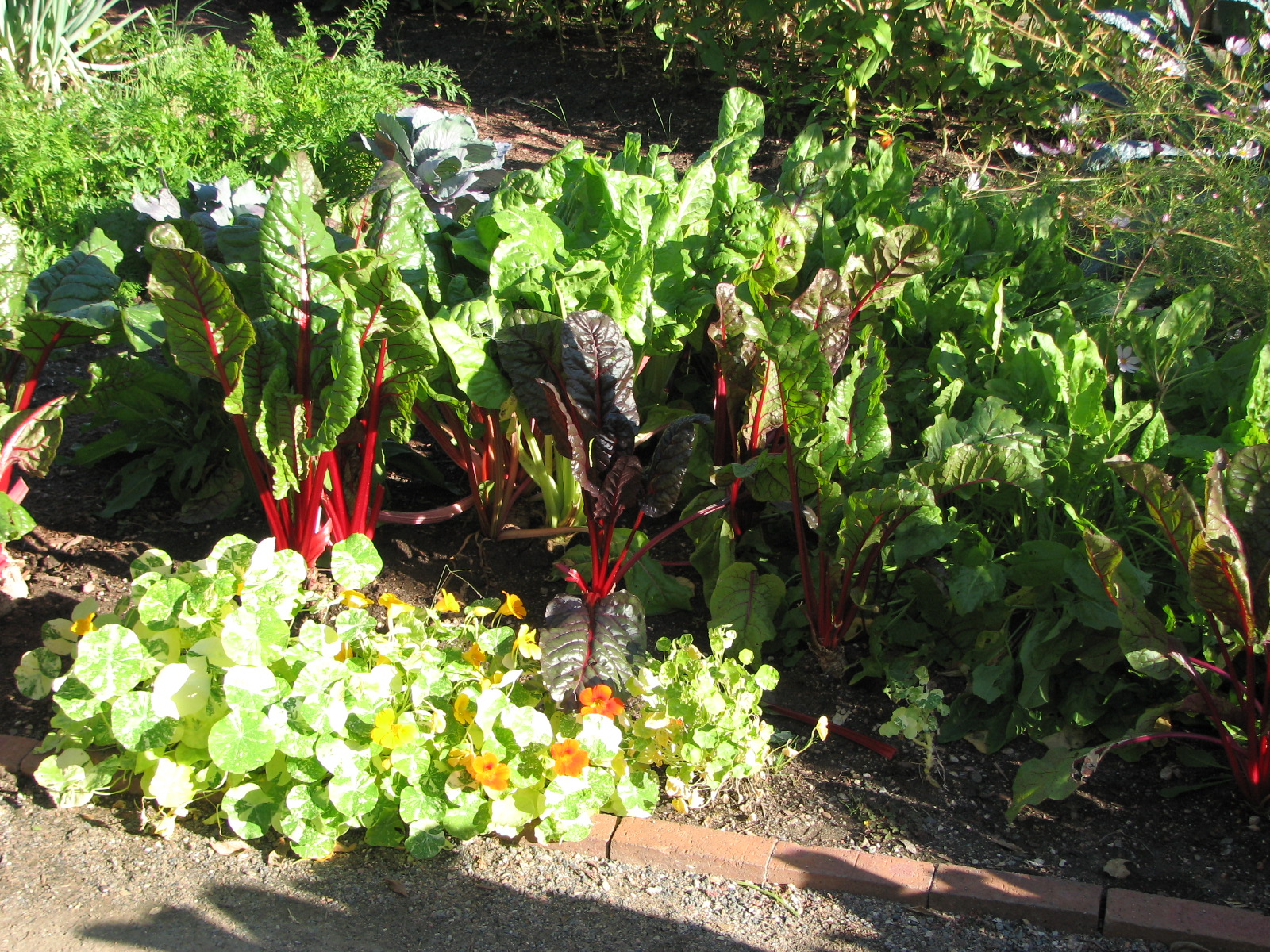 Use chard as an accent among other vegetables or as a contrast to brightly colored annuals.  Pop a few Rainbow Chard in your flower beds or pots for added color, providing a bright, midsummer display.  Edible Landscape!