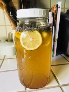 Combine the water, honey, vinegar, lavender, and lemon in a clean half-gallon mason jar, cover with a lid, and shake well until all the honey has dissolved. Set the mixture aside to ferment, covered, at room temperature for 2 days.